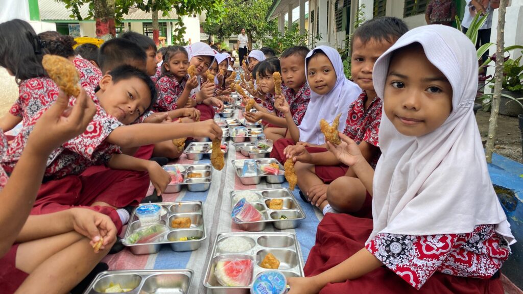 Ilham pelajar kelas 6 mengakui kelezatan MBG yang disajikan SPPG Firdaus I secara prasmanan lalu dimakan bersama dengan siswa lain. Ilham pun tampak bahagia bisa makan nambah.