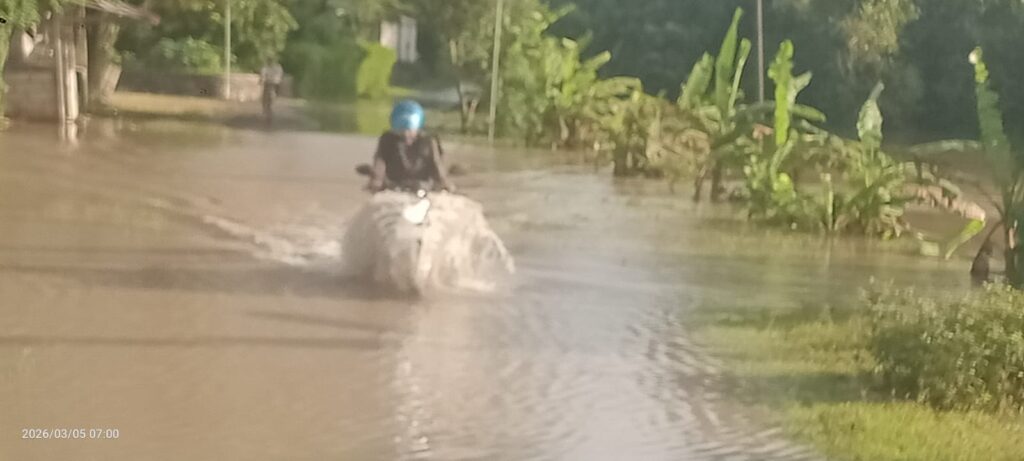 SRAGEN INDOGLOBENEWS.COM – Hujan deras yang mengguyur wilayah Banaran sejak semalam membuat debit air sungai meluap dan merendam area persawahan warga di Dukuh Karangasem Desa Banaran , Kecamatan Sambungmacan Kabupaten Sragen pada Rabu (04/03/2026).