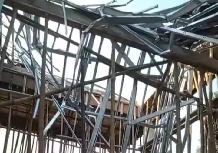 Poto breaking news atap kontruksi baja ringan gedung SMK unggulan di Desa Kedawung Kecamatan Mondokan Sragen ambruk timpa 7 pekerja Sabtu sore 15/4/2026 , poto istimewa ———————————————————————-