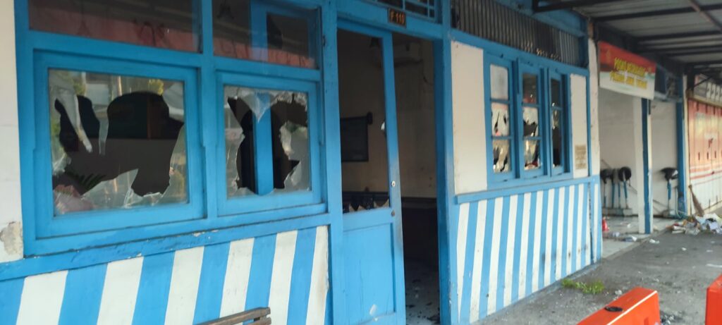 Pos Polisi Pasar Kota, seperti yang terlihat, mengalami kerusakan parah dengan kaca-kaca pecah berantakan. Tidak hanya bagian luar, kerusakan juga terlihat hingga bagian dalam pos. Pemandangan serupa juga terjadi di Pos Polisi Alun-Alun Sragen, di mana kaca-kaca pos hancur berserakan.