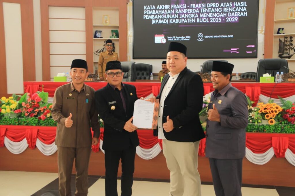 Rapat Paripurna DPRD Buol yang digelar di ruang rapat utama Kantor DPRD pada Senin (8/9), menjadi momentum penting bagi arah pembangunan daerah lima tahun ke depan. Dipimpin Ketua DPRD Ryan Nathaniel Kwendy, seluruh fraksi menyampaikan kata akhir dan secara bulat menyetujui Rancangan Peraturan Daerah (Ranperda) tentang Rencana Pembangunan Jangka Menengah Daerah (RPJMD) Pemda Kabupaten Buol Tahun 2025–2029.