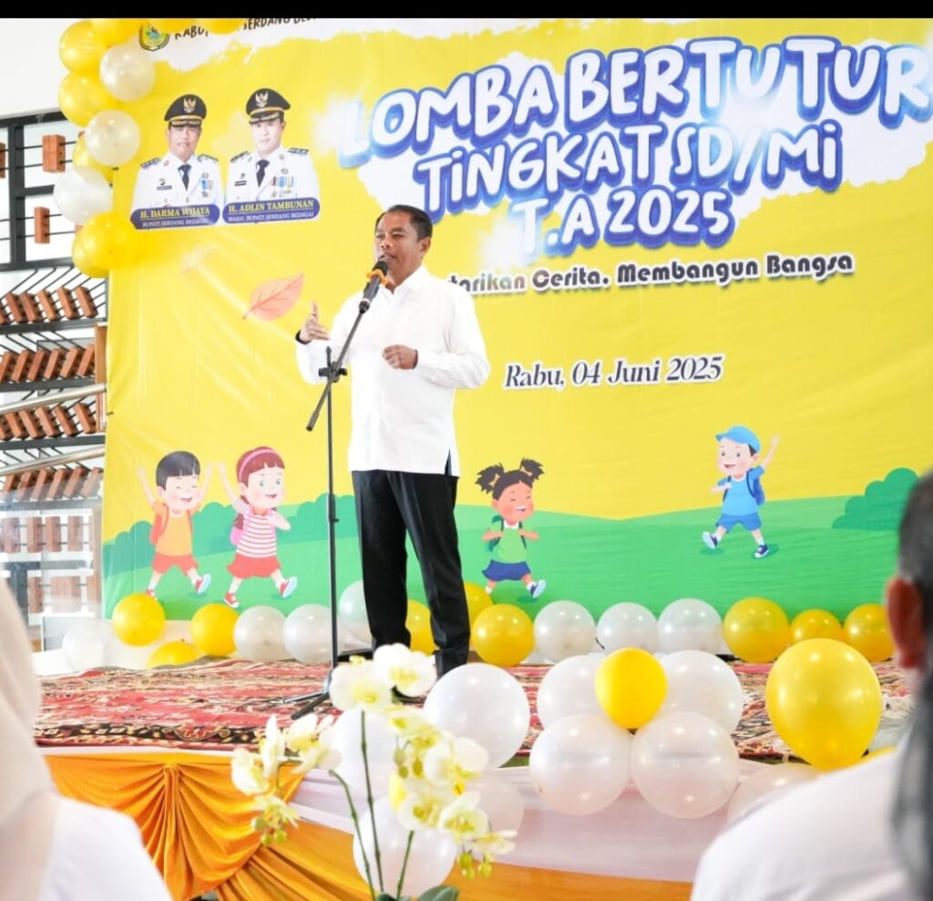 Bupati Serdang Bedagai (Sergai) Darma Wijaya mengapresiasi kegiatan lomba bertutur tingkat Sekolah Dasar (SD) dan Madrasah Ibtidaiyah (MI) yang diselenggarakan oleh Dinas Perpustakaan dan Arsip (Dinas Perpusip) di Gedung Perpustakaan Daerah Kabupaten Sergai, Rabu (4/6/2025).