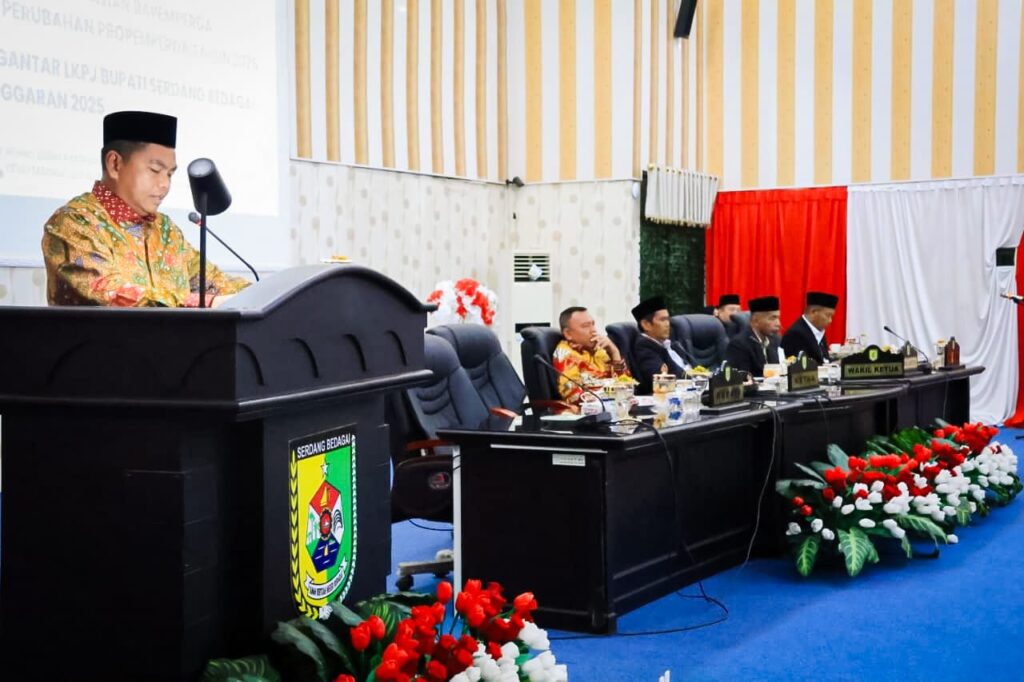 Bupati Serdang Bedagai (Sergai) H. Darma Wijaya menyampaikan Nota Pengantar Laporan Keterangan Pertanggungjawaban (LKPJ) Tahun Anggaran 2025 dalam Rapat Paripurna DPRD Kabupaten Sergai yang digelar di Ruang Rapat Paripurna DPRD Sergai, Sei Rampah, Kamis (26/3/2026). LKPJ ini merupakan potret capaian tahun kelima dari periode kepemimpinan Bupati H. Darma Wijaya bersama Wakil Bupati H. Adlin Tambunan.