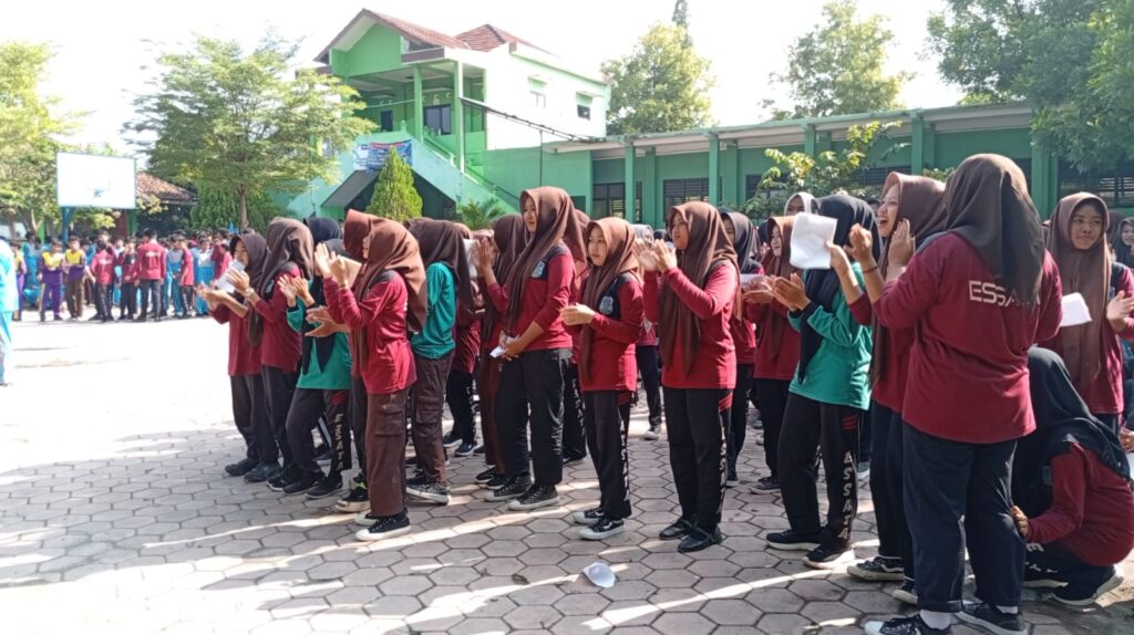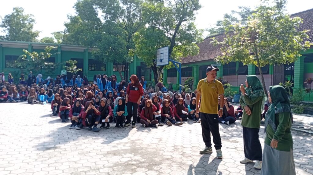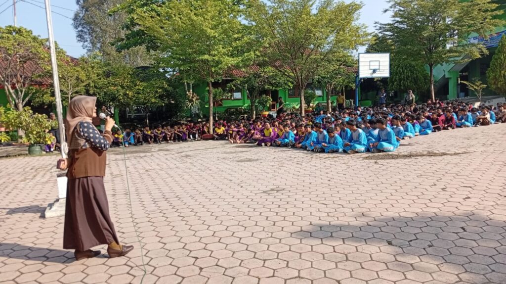 Poto Kepala SMPN 1 Tangen Tri Wahyuni M.Pd menyampaikan arahan untuk seluruh siswa, untuk tidak lakukan Bullying dan kekerasan di sekolah maupun di luar sekolah Jumat 10/4/2026——————————————————