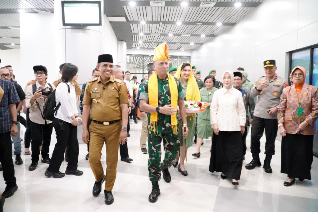 PALU indoglobenews.com – Gubernur Sulawesi Tengah, Dr. H. Anwar Hafid, M.Si., bersama Ketua TP-PKK Sulteng, Hj. Sry Nirwanti Bahasoan, menyambut kedatangan Panglima Kodam XXII/Palaka Wira, Mayjen TNI Jonathan Binsar Parluhutan Sianipar, di Bandara Mutiara SIS Al-Jufri Palu, Selasa (1/9/2025). Pangdam tiba bersama istri, Ny. Irianty Chendradewi, untuk memulai tugas resmi sebagai pimpinan komando teritorial yang membawahi Sulawesi Tengah dan Sulawesi Barat.