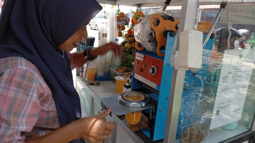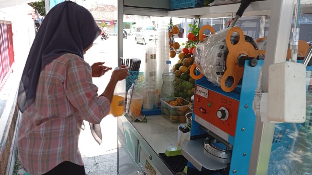 Poto Rini pedagang es jeruk peras Sukowati yang mangkal di samping Bank Djoko Tingkir Sragen, menaikan harga akibat naiknya harga gelas plastik cup, meski demikian pelanggan tidak merasa keberatan atas kenaikan itu Rabu 15/4/2026 .————————————————————-