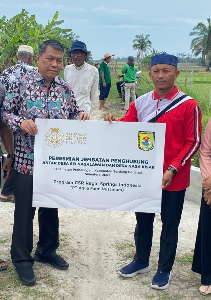 Regal Springs Indonesia (PT Aqua Farm Nusantara) kembali menunjukkan komitmennya dalam mendukung pembangunan masyarakat melalui peresmian jembatan penghubung antara Desa Sei Nagalawan dan Desa Naga Kisar, Kabupaten Serdang Bedagai Sumatera Utara. Jembatan yang berlokasi di Dusun II Sei Nagalawan ini diharapkan dapat memperlancar mobilitas warga serta mendorong pertumbuhan sosial dan ekonomi antar desa.