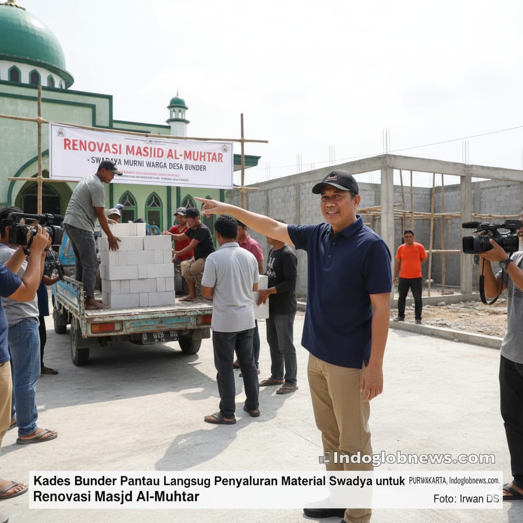 PURWAKARTA, Indoglobenews.com – Kepala Desa Bunder, Tedy Moch Taufik, turun tangan langsung memantau dan mengecek pengiriman material swadaya warga untuk renovasi Masjid Al-Muhtar di desanya, Rabu (24/12).
