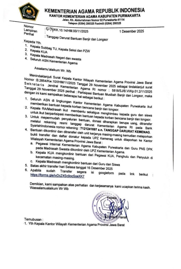 Purwakarta, Indoglobenews.com – Kantor Kementerian Agama (Kankemenag) Kabupaten Purwakarta menggalang dana tanggap darurat bagi korban banjir dan tanah longsor di Sumatera Utara. Penggalangan dana ini berlangsung hingga 16 Desember 2025, merespons instruksi pusat untuk menanggulangi bencana yang telah menelan ratusan korban jiwa.