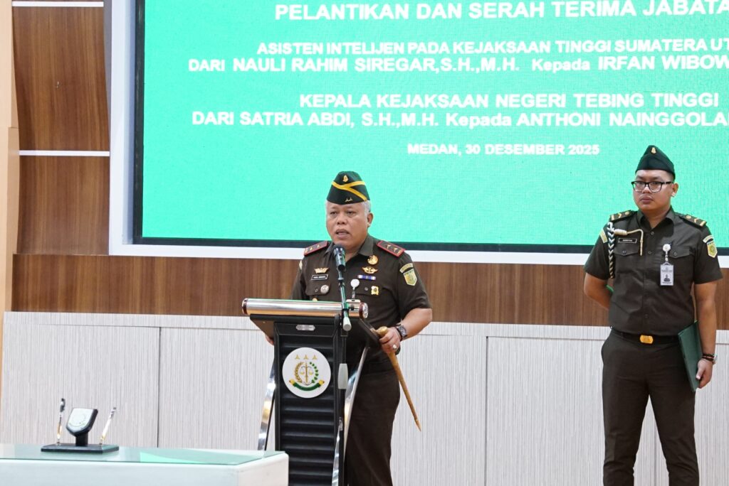 Medan indoglobe news.com [30/12/2025], Kepala Kejaksaan Tinggi Sumatera Utara Dr.Harli Siregar,SH.,M.Hum memimpin pelantikan dan serah terima jabatan (sertijab) Asisten Intelijen dan Kajari Tebing Tinggi pada hari Selasa 30 Desember 2025 yang berlangsung di Aula Cipta Kerta lantai III Jalan Jenderal Besar AH Nasution Medan.