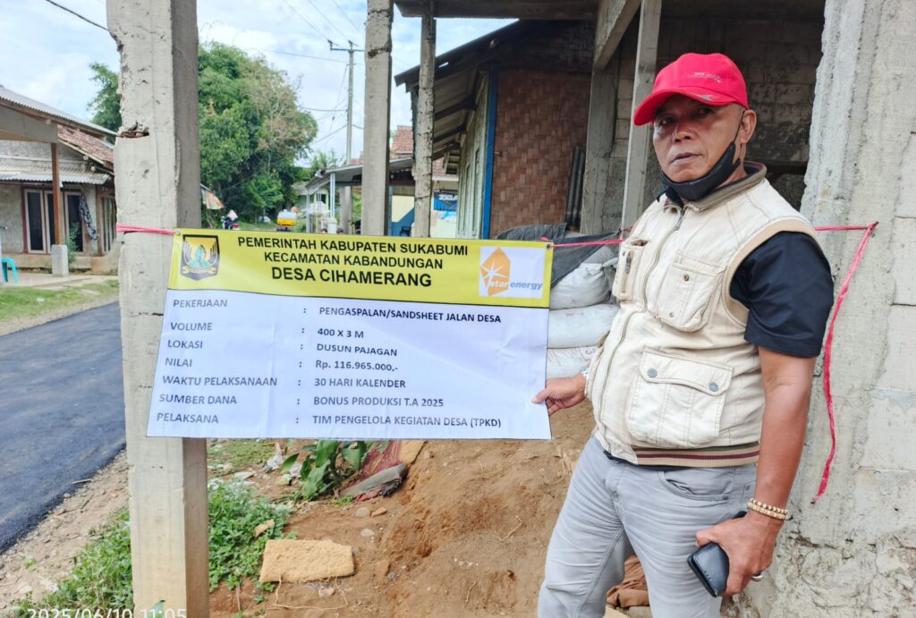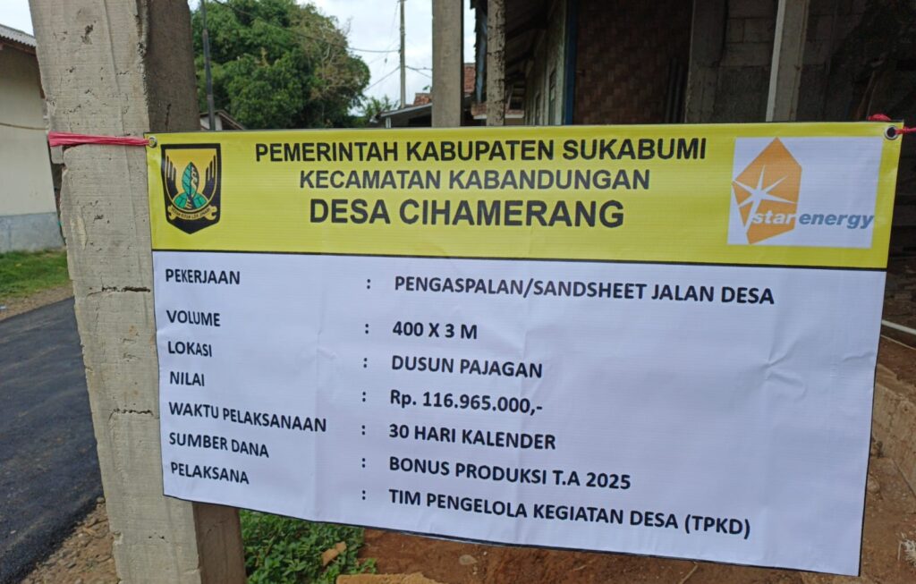 Pengaspalan jalan lingkungan sepanjang 400 m x 3 m ini Dengan menggunakan Dana Bonus produksi tahun 2025 Sebesar Rp. 116.965.000.dilaksanakan oleh Team pengelola kegiatan Desa( TPKD) Desa Cihamerang kecamatan Kabandungan