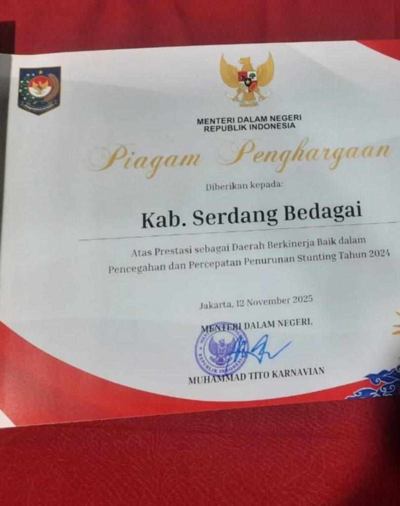Bupati Serdang Bedagai H. Darma Wijaya mengatakan Pemerintah Kabupaten Serdang Bedagai kembali mencatatkan prestasi membanggakan di tingkat nasional. Pada tahun 2024, Kabupaten Serdang Bedagai resmi menerima piagam Penghargaan dari Kementerian Dalam Negeri Republik Indonesia atas keberhasilannya sebagai Daerah Berkinerja Baik dalam Pencegahan dan Percepatan Penurunan Stunting.