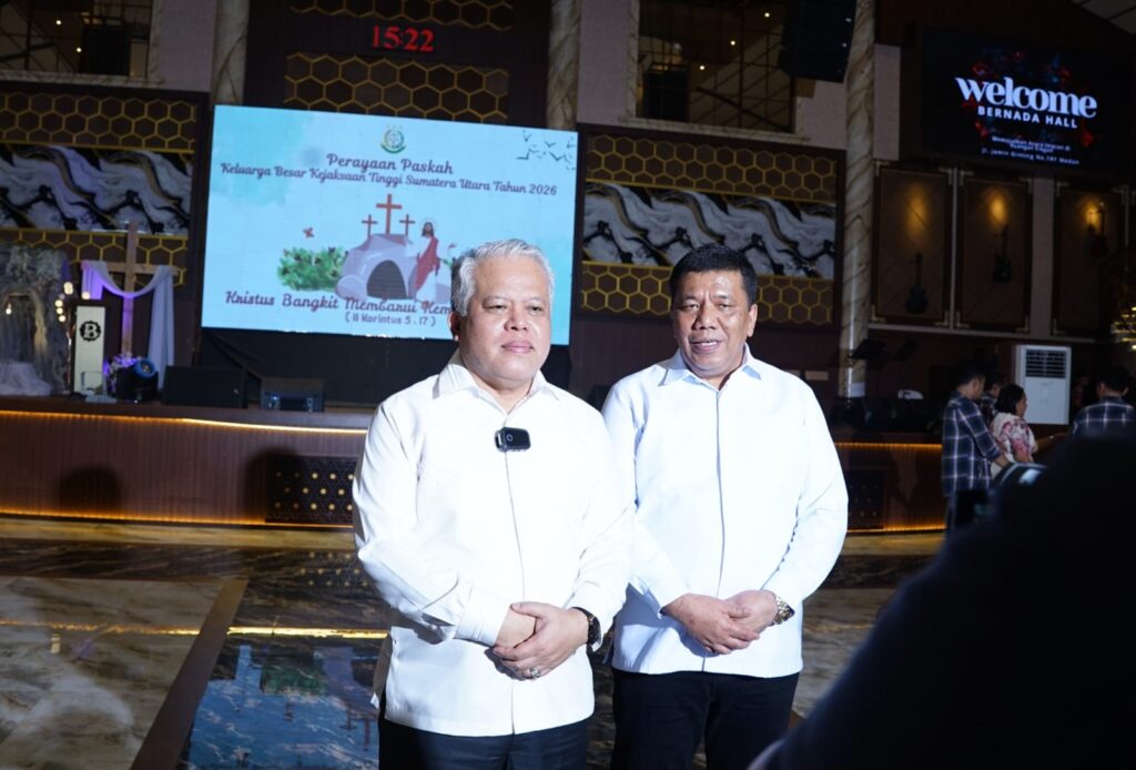 Medan indoglobe news.com[12/4/2026], Dengan mengusung tema paskah nasional tahun 2026 “Kristus Bangkit Membarui Kemausiaan Kita”, Keluarga besar Kejaksaan Tinggi Sumatera Utara menggelar perayaan paskah yang dilaksanakan di gedung Bernada Hall Jalan Letjend Jamin Ginting, Kwala bekala Kota Medan pada hari Minggu (12/4/2026).