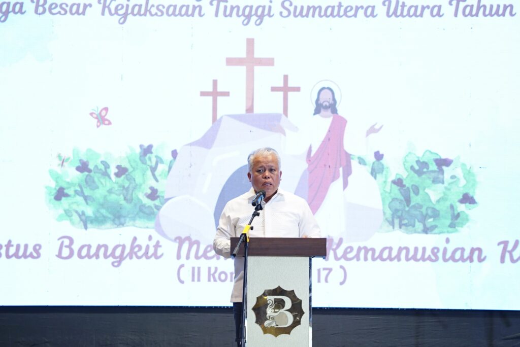 Sementara itu, Ketua Tim Tenaga Ahli Jaksa Agung R.I yang saat ini dipercaya sebagai juru bicara Satgas PKH Dr. Barita Simanjuntak saat menyampaikan sambutannya menyampaikan rasa bangga dan semangat kepada Kajati Sumut serta seluruh jajaran Kejaksaan Tinggi Sumatera Utara atas penyelenggaraan perayaan paskah ini, “patut kita syukuri bersama bahwa hari paskah dapat dirasakan dengan perayaan ini, semangat kebangkitan untuk semakin memperbarui diri agar dalam melaksanakan tugas penegakan hukum dapat semakin ber integritas dan berlandaskan keadilan dan kemanusiaan” (Donald).