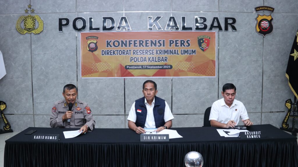 Konferensi Pers dipimpin oleh Ditreskrimum Polda Kalbar, Kombes Pol Raswin Bachtiar Sirait, S.H, S.I.K. M.Si didampingi oleh Kasubbid Penmas Bidhumas Polda Kalbar, AKBP Prinanto, dan Kasubdit Kamneg, Kompol Lely Suheri, S.H, M.M serta dihadiri oleh Para Awak Media baik Lokal maupun Media Nasional. (Rabu, 17/9/2025)