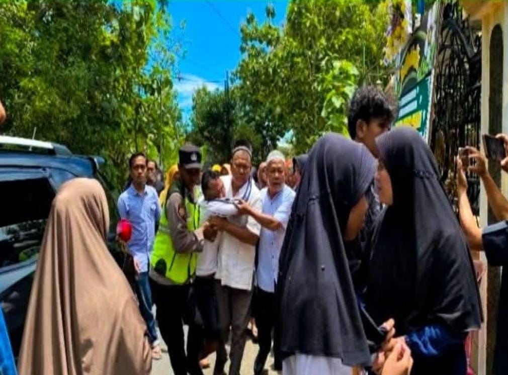 Dengan mengenakan kaus putih, celana selutut, dan tanpa alas kaki, ia harus dibopong warga menuju rumah duka.