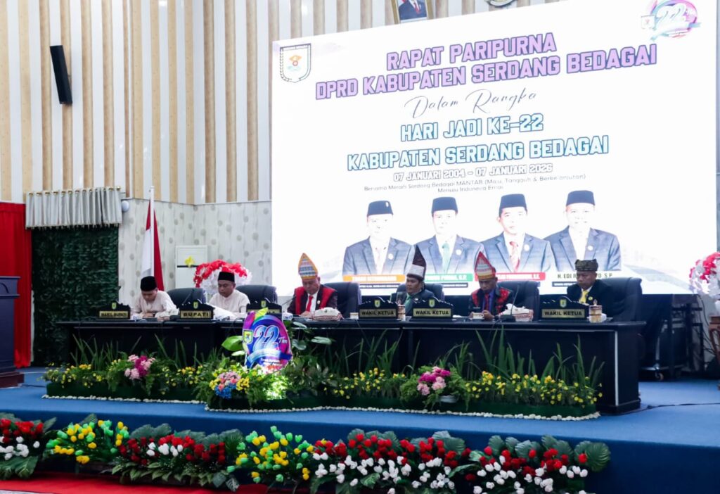 Puncak Hari Jadi ke-22 Kabupaten Serdang Bedagai (Sergai) yang jatuh hari ini, Rabu (7/1/2026) ditandai dengan digelarnya sidang paripurna istimewa di Gedung DPRD Kabupaten Sergai di Sei Rampah.