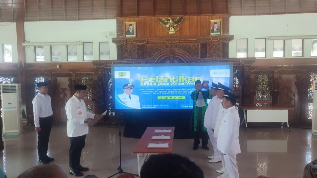 SRAGEN INDOGLOBENEWS .COM – Sempat menjadi pertanyaan publik hal waktu pelantikan tiga Kepala Desa Antar Waktu (PAW) di Kabupaten Sragen akhirnya terjawab. Bertempat di Pendopo Bupati, Kamis (2/4/2026) Bupati Sragen Sigit Pamungkas resmi melantik tiga kades terpilih hasil Musyawarah Desa (Musdes) Maret lalu.