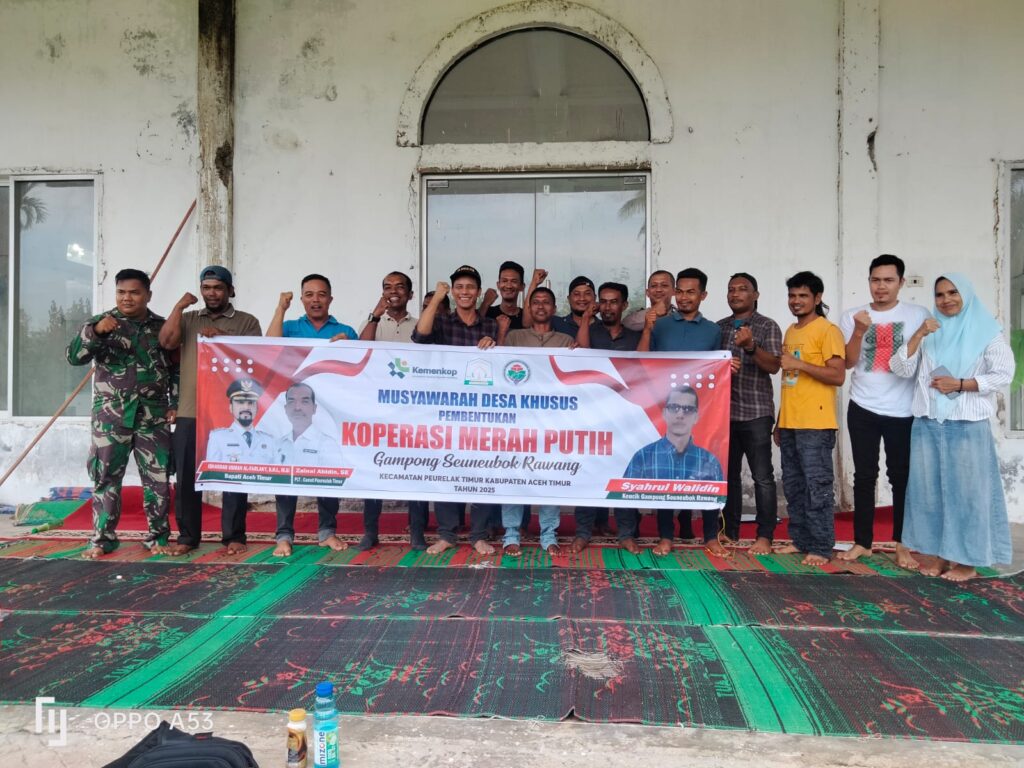 ”Pembentukan ini diputuskan dalam Musyawarah Desa Khusus (Musdesus) yang digelar sabtu 31/5/2025 .di Meunasah gampong seuneubok rawang Musdesus dihadiri oleh Perangkat desa, Muspika ,Peureulak Timur Babinsa,Babinkamtibnas,tokoh masyarakat, Pelaku UKM, serta Pendamping desa. Hadir pula pemateri dari Kecamatan,yang memberikan penjelasan teknis mengenai pembentukan dan peran koperasi dalam ekonomi desa.